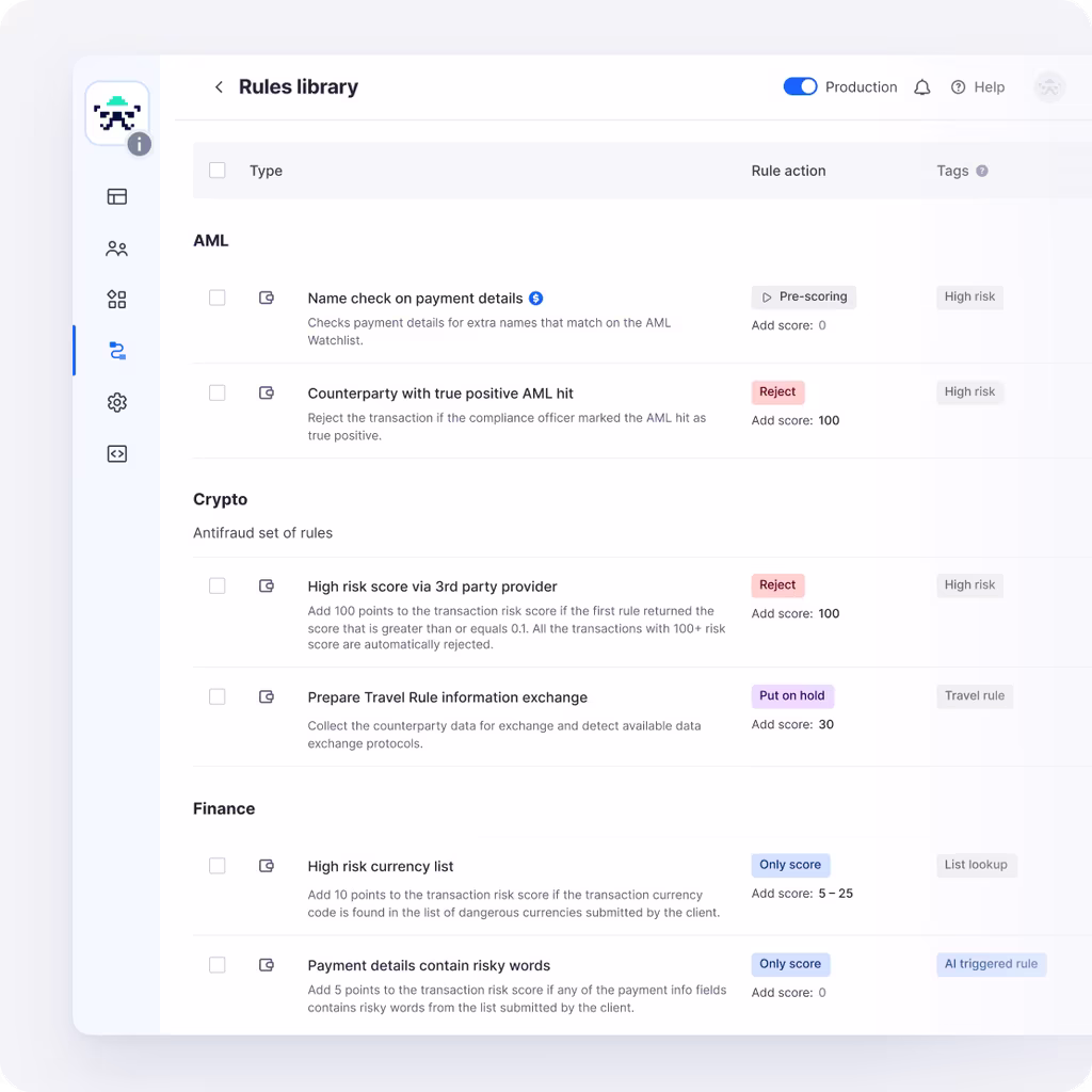 Entdecken Sie über 300 vorgefertigte Regeln, angepasst an verschiedene Branchen wie Fintech, traditionelle Finanzen, Krypto, E-Commerce und iGaming. Erstellen Sie unbegrenzt benutzerdefinierte Regeln mit Ihren eigenen Datenquellen – ganz ohne Programmierkenntnisse – und testen Sie sie im Probelauf für eine nahtlose Integration.