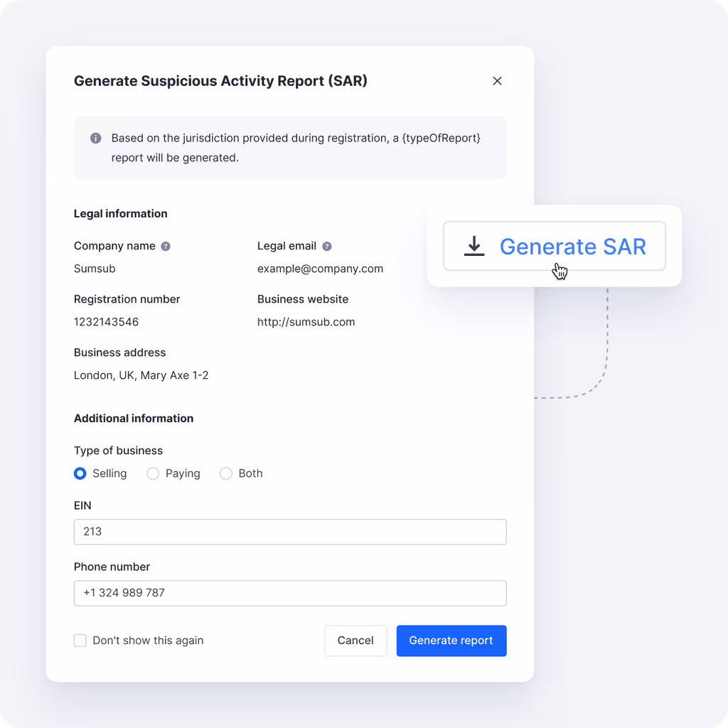 Sparen Sie wertvolle Zeit mit der automatisierten SAR/STR-Funktion von Sumsub, indem Sie verdächtige Aktivitäten erkennen und archivierbare Berichte erstellen. Konzentrieren Sie sich auf den Schutz Ihres Unternehmens vor Finanzkriminalität, ohne Ressourcen für veraltete manuelle Datensichtungsprozesse zu verschwenden.